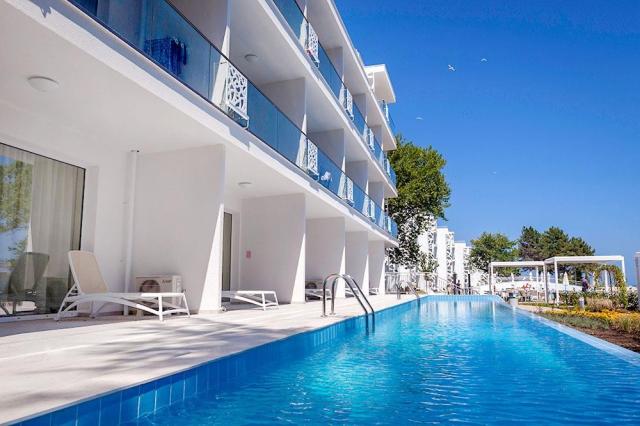 Dlhá piesočnatá pláž priamo pri hoteli, 2 ležadlá a slnečník na izbu zadarmo.